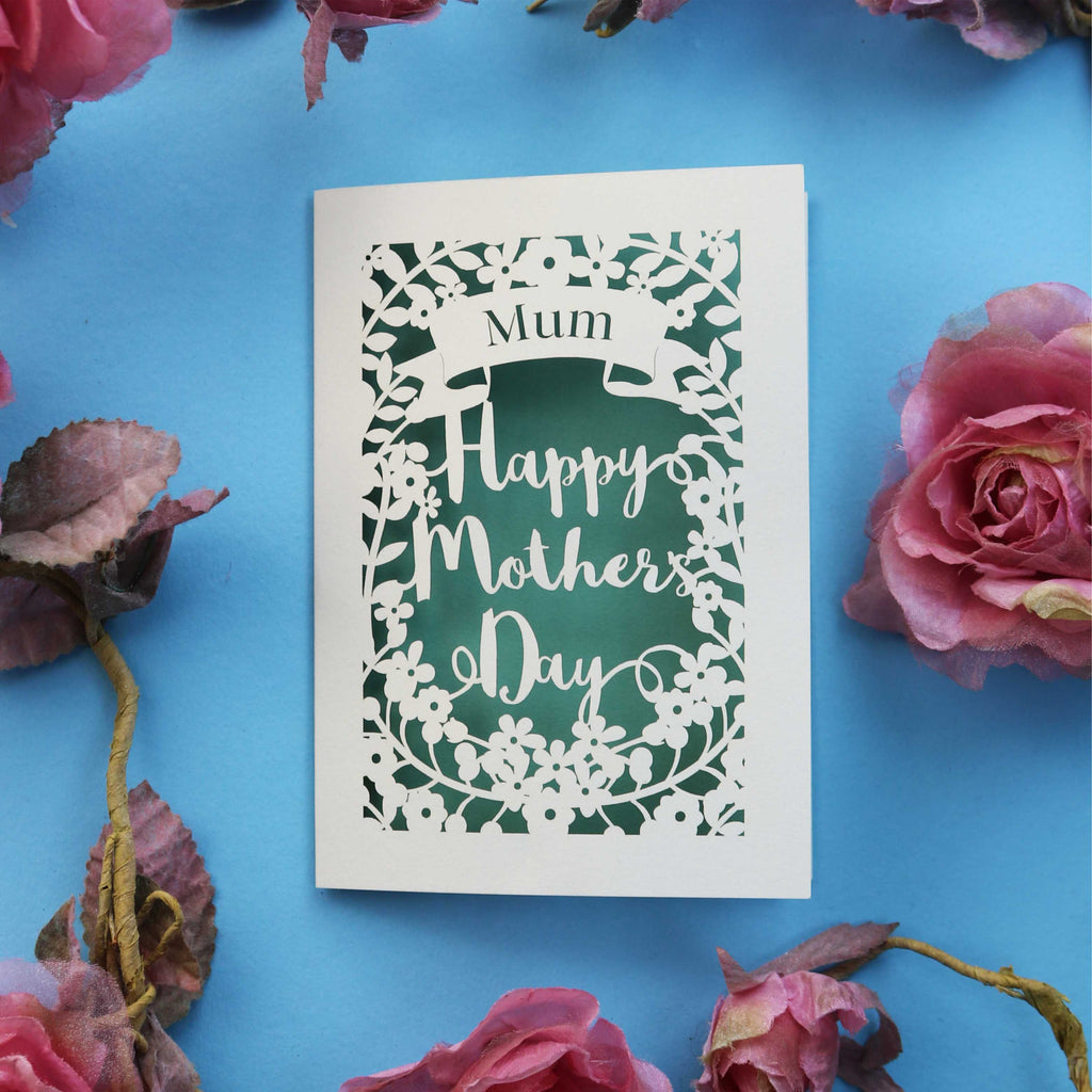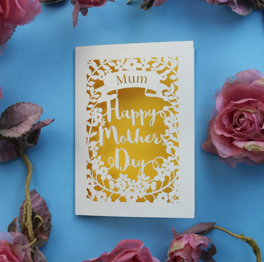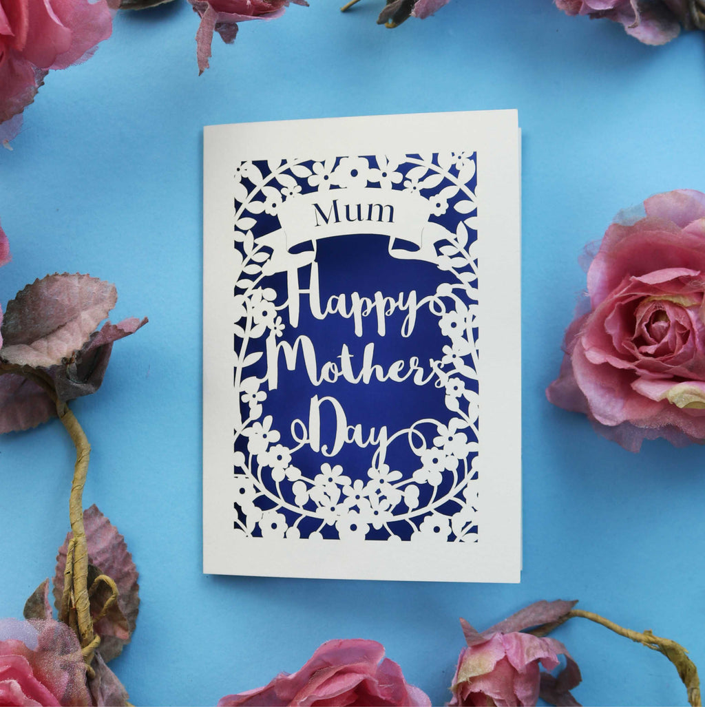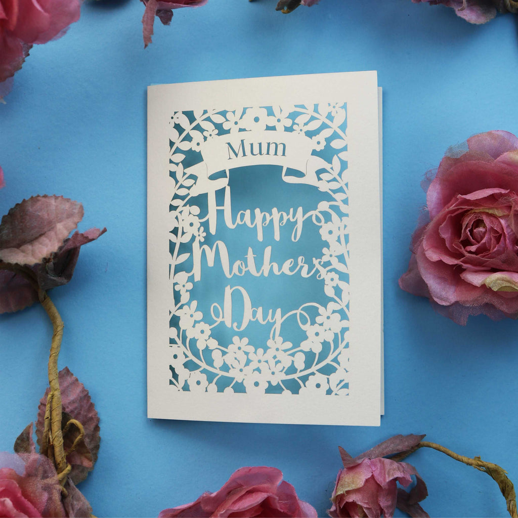 This beautiful laser cut Mother's Day card can be personalised with the recipient's name, making it perfect for mums, step mums, grandmothers. All cards will read "Name, Happy Mother's Day"